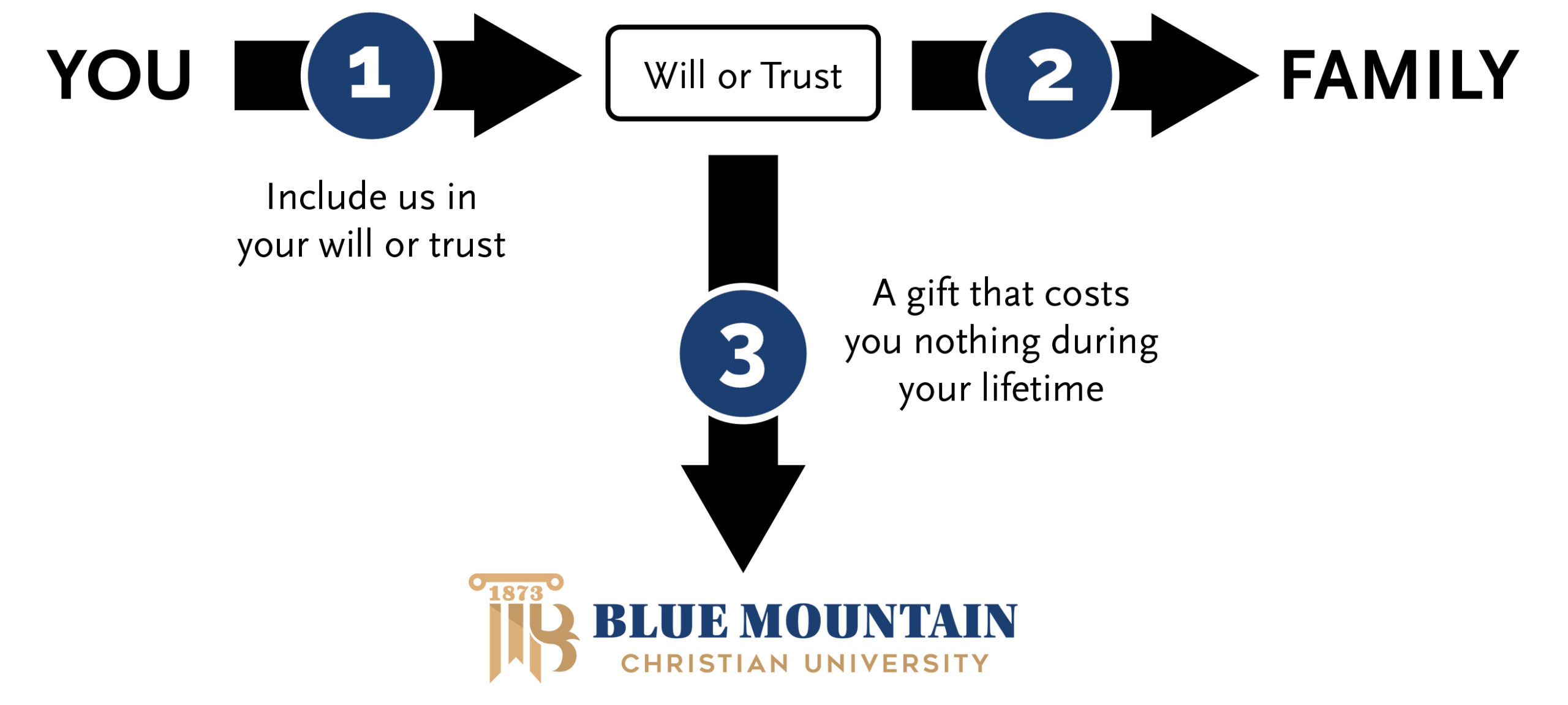 This is one of the easiest gifts to give and one of the most useful in accomplishing your philanthropic goals. The next time you visit your bank, you can name Blue Mountain Christian University (Tax ID: 64-0325640) as the beneficiary of a checking or savings bank account, a certificate of deposit (CD), or a brokerage account. When you do, you’re investing directly in students—their dreams, their calling, and their Christ-centered education.